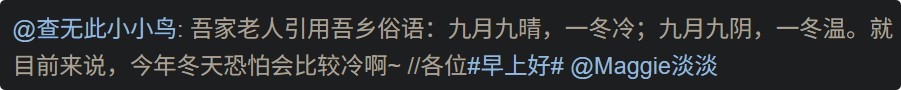 (3/5)今天是农历九月初九重阳节。我们老家有句俗话说:九月九晴一冬冷,九月九阴一冬温。今天是阴天(雾霾),看来这个冬天会比较暖和了。