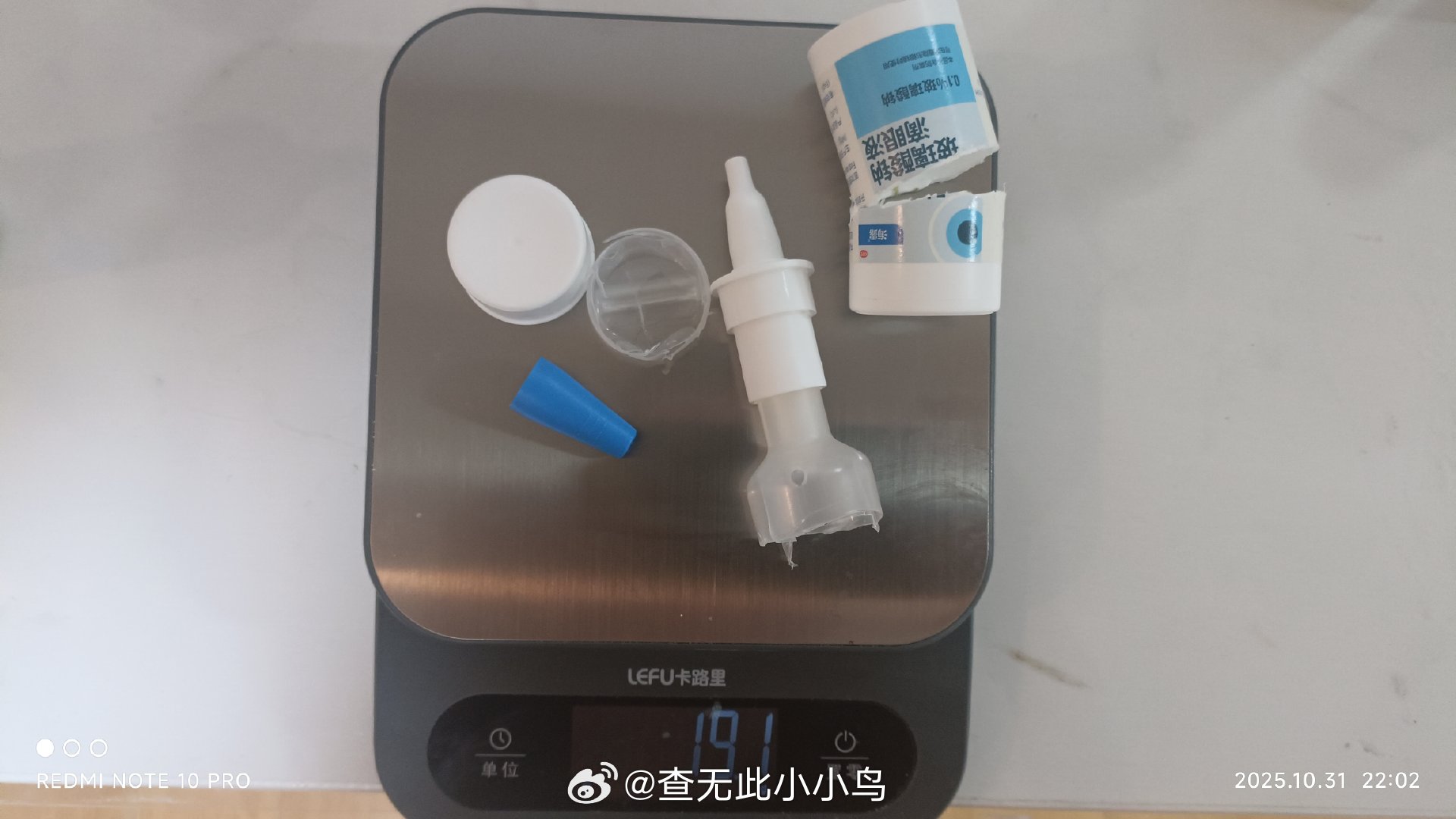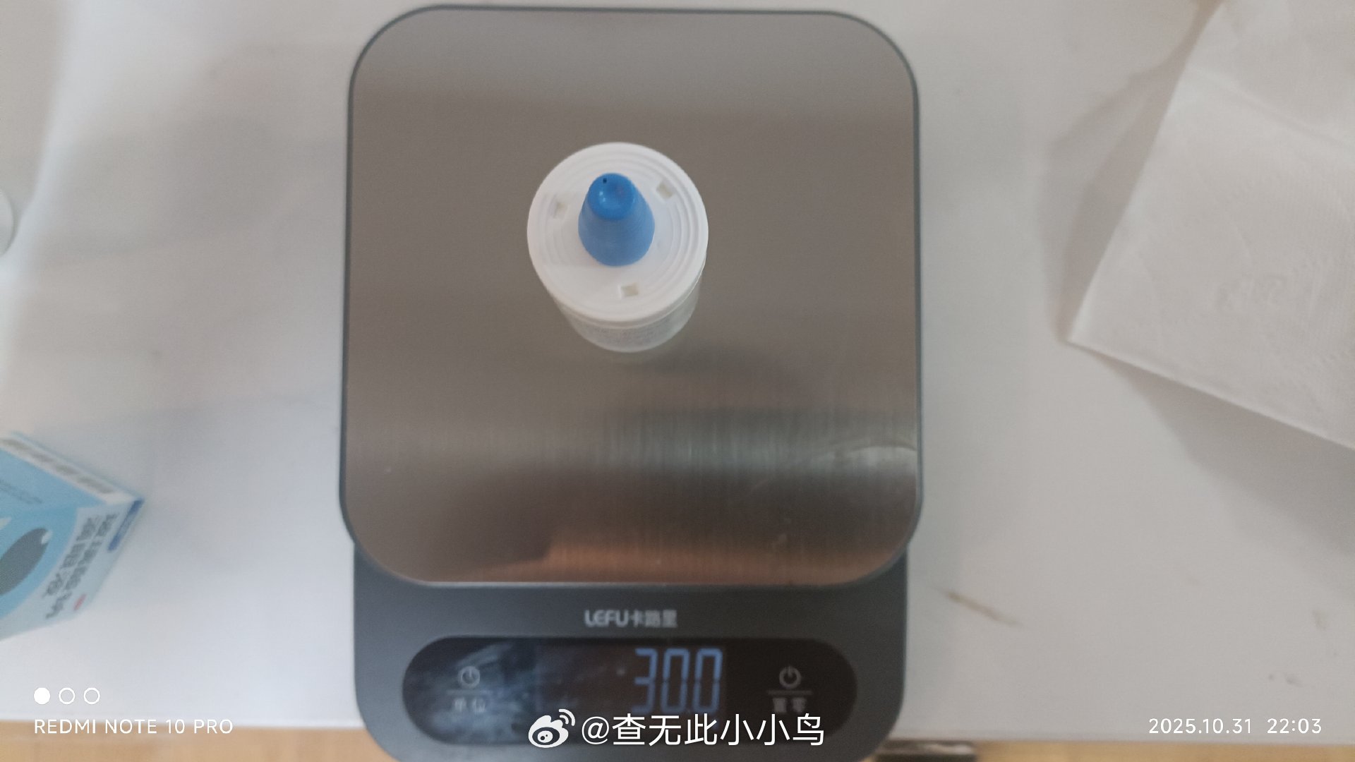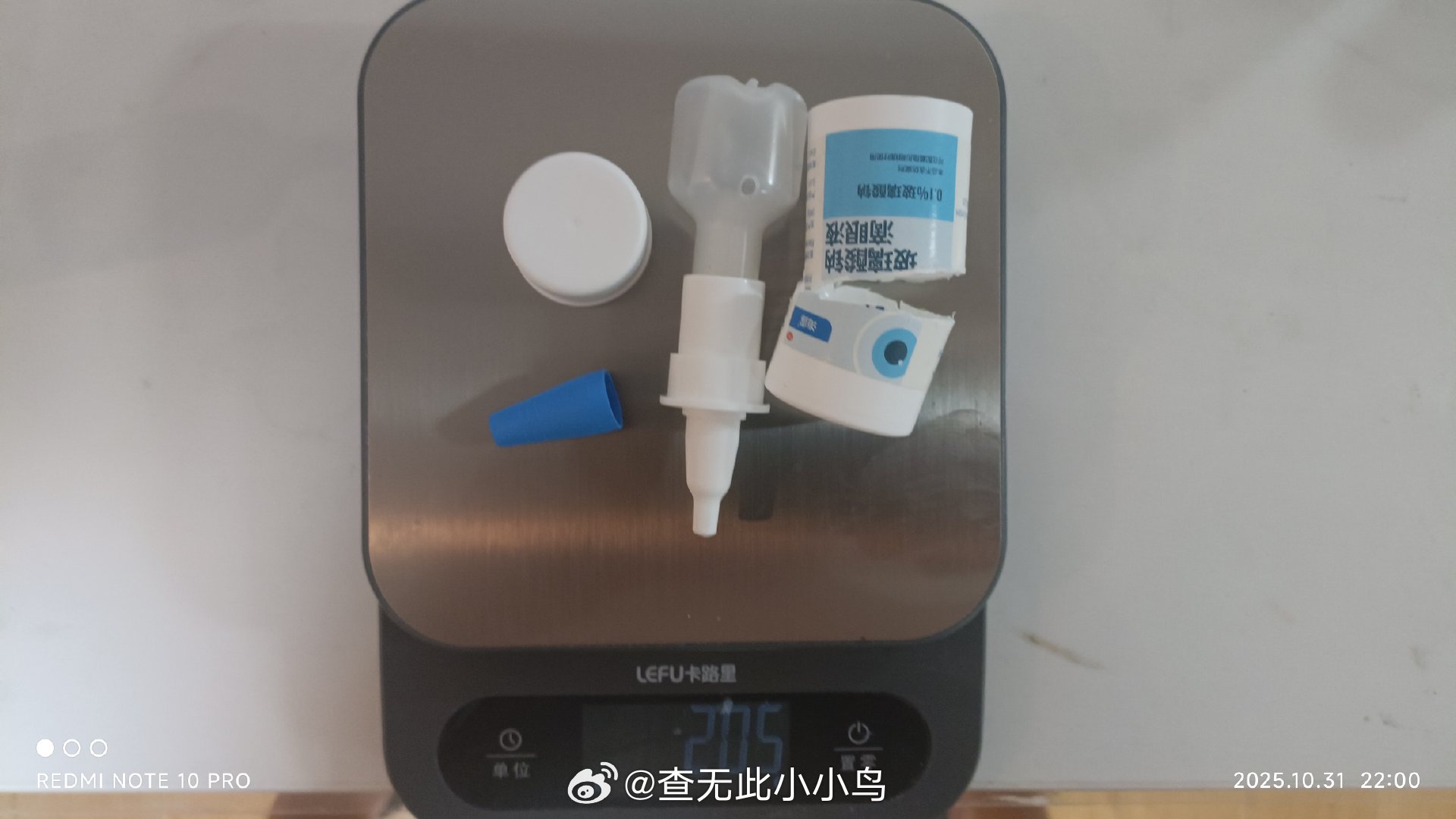 包装标称10ml(按水的密度为10g计)。图1是未使用的,30.0g;图2是滴不出来后破解外壳(未破坏内胆),20.5g,且明显可以看到内胆中还留有不少液体;图3破开内胆并倒掉其中液体后,19.1g(20.5-19.1=1.4)。